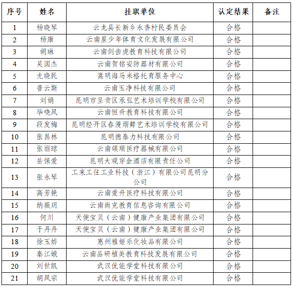 序号 姓名 挂职单位 认定结果 备注 1 杨晓琴 云龙县长新乡永香村民委员会 合格 2 杨康 云南星少年体育文化发展有限公司 合格 3 胡琳 云南剑齿虎教育科技有限公司 合格 4 吴国杰 云南贺铭安防器材有限公司 合格 5 尤晓民 嵩明海马米格托育服务中心 合格 6 普云斯 云南玉净科技有限公司 合格 7 刘娟 昆明市呈贡区承弘艺术培训学校有限公司 合格 8 毕哓凤 云南恒升教育科技有限公司 合格 9 段发梅 昆明经开区春漫熠舞艺术培训学校有限公司 合格 10 张昌林 昆明德泰力科技有限公司 合格 11 张丽琼 云南颌顺医疗器械有限公司 合格 12 岳保爱 昆明大观穿金酒店有限责任公司 合格 13 张永琴 工来工往工业科技(浙江)有限公司昆明分公司 合格 14 高芳艳 云南爱升医疗科技有限公司 合格 15 纳薇玥 云南尚克教育信息咨询有限公司 合格 16 何川 天使宝贝(云南)健康产业集团有限公司 合格 17 于丹丹 。